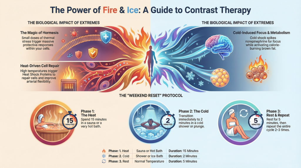 We live in an incredibly comfortable, “climate controlled” world, shuffling seamlessly from 22°C houses to 22°C cars, and finally into 22°C offices. While this unwavering thermal consistency feels undeniably pleasant, it has essentially made our internal regulatory systems “lazy”. It is time to step out of that cozy bubble and embrace what is hailed as 2026’s most powerful recovery habit: Contrast Therapy, the invigorating practice of intentionally exposing your body to the extremes of heat and cold.